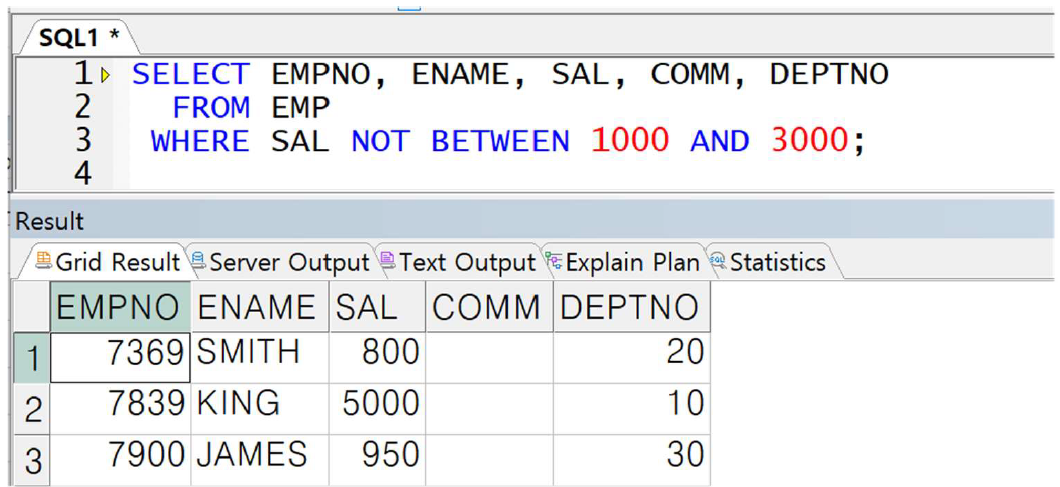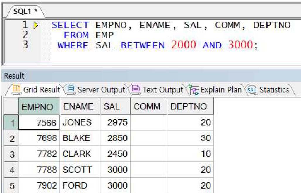 -> BETWEEN 연산자를 사용하면 SAL에 대한 반복을 할 필요 없음