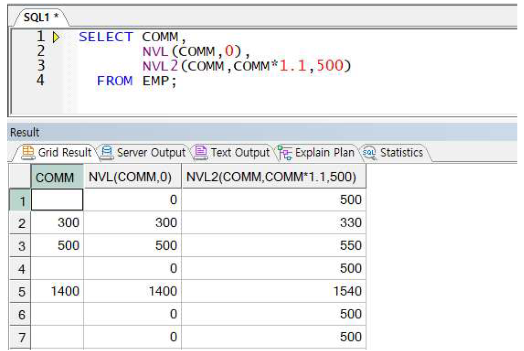 -> NVL2의 경우 COMM이 널이 아니면 10% 인상값, 널이면 500 리턴