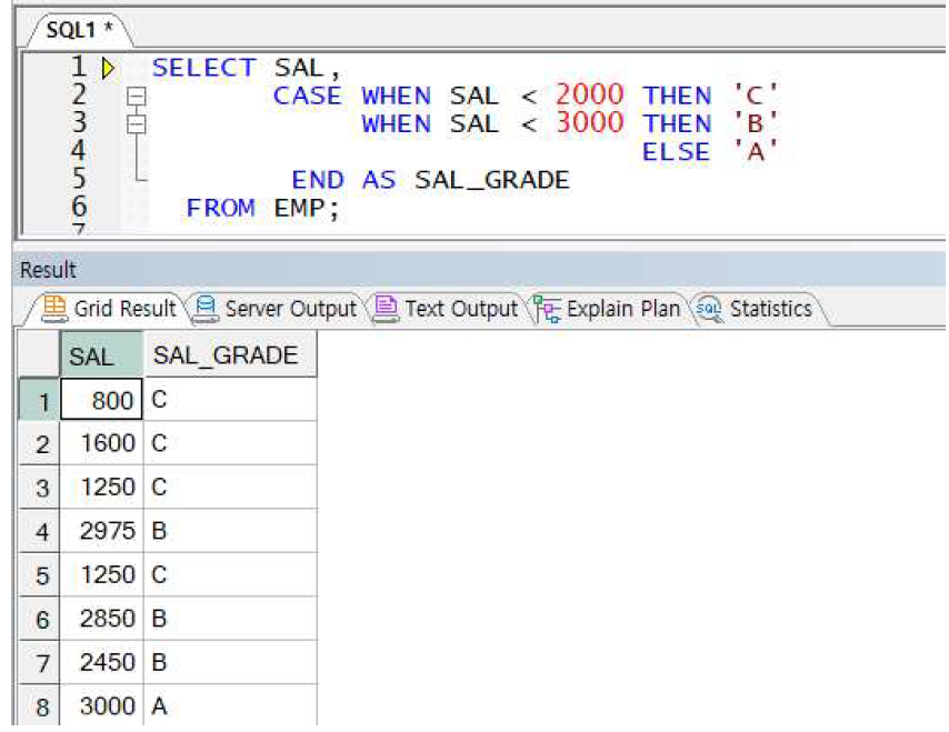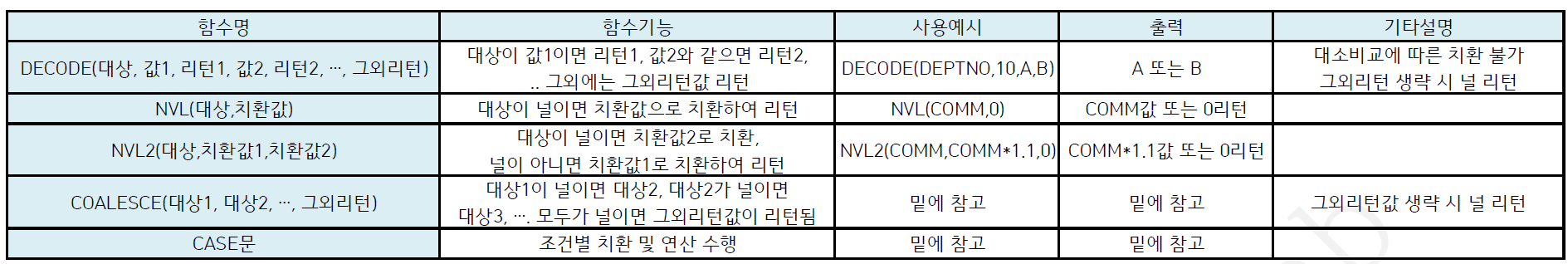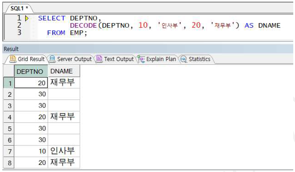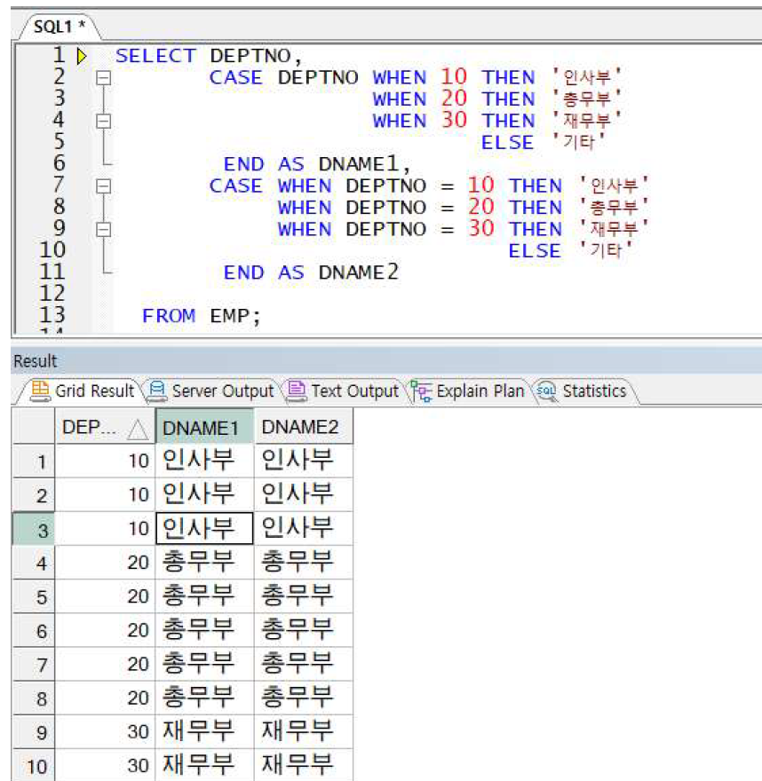 -> 동등비교 시 위처럼 비교대상(DEPTNO)를 CASE와 WHEN 사이에 배치하면서 WHEN절 마다 반복하지 않아도 됨(이 때 DEPTNO. 데이터 타입과 WHEN절의 명시된 비교대상의 데이터타입 반드시 일치해야 함)