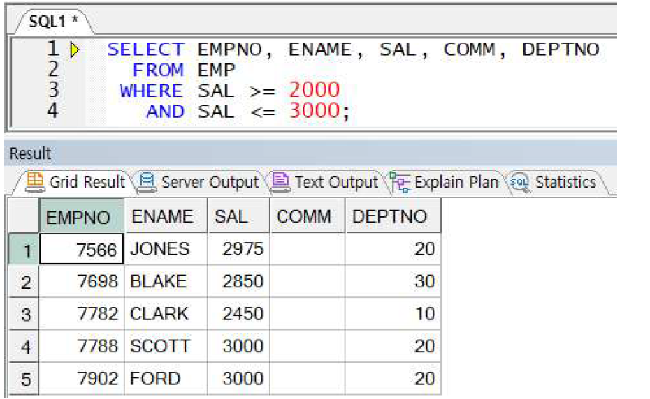 예제) SAL이 2000이상 3000이하인 직원 정보 출력