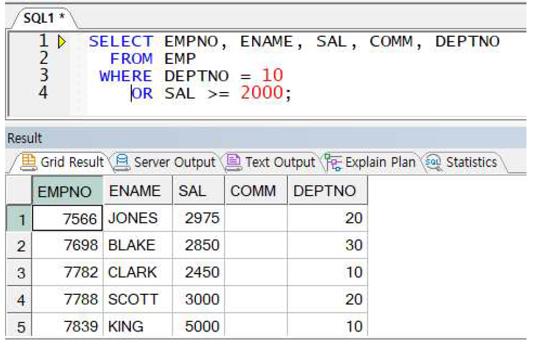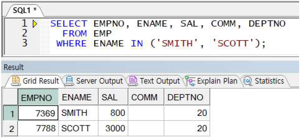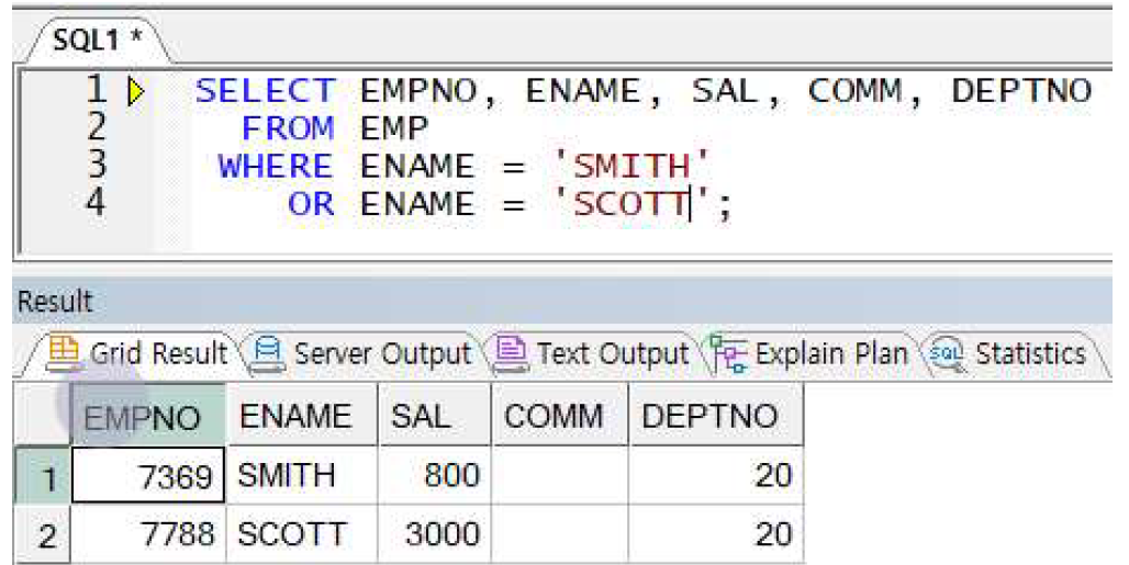 -> 이름이 SMITH 이면서 SCOTT일 수는 없으므로 두 조건을 각각 만족하는 합집합을 구하라는 의미임. 하지만 동일한 조건대상(ENAME)이 계속 반복돼야 하는 불편함이 있음 -> IN 연산자 사용