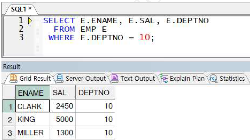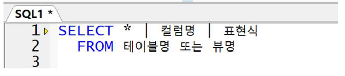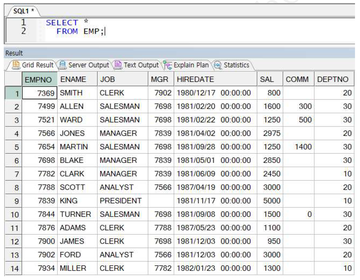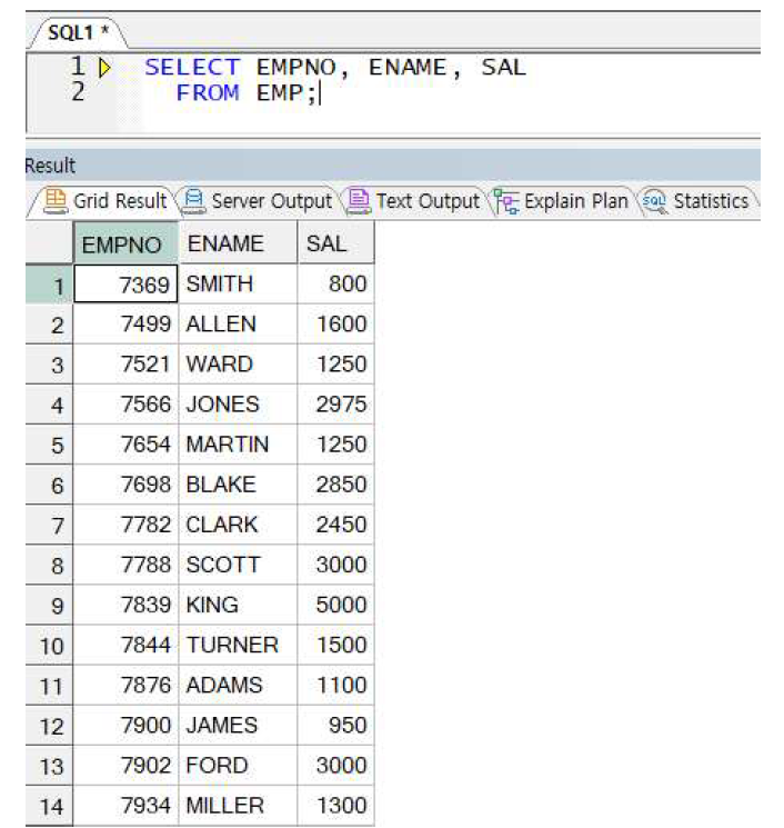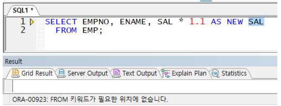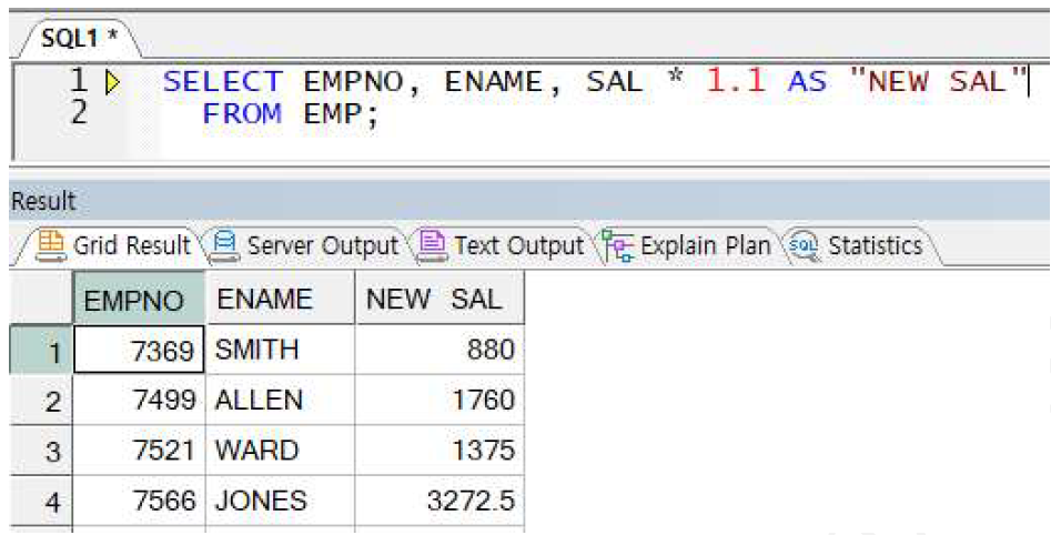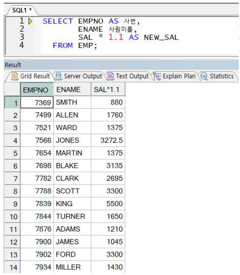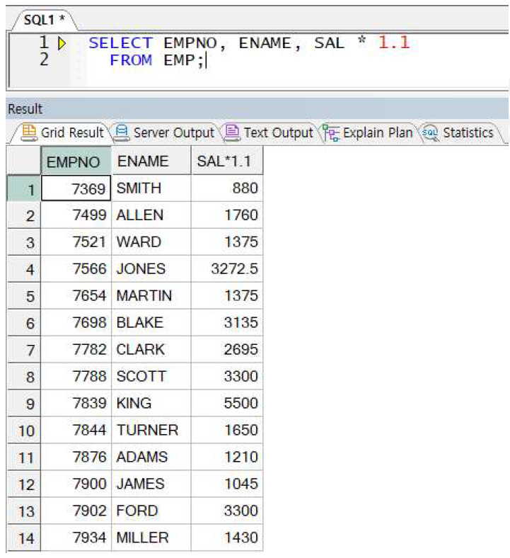 ☞ SAL * 1.1이라는 컬럼은 없지만 기존 컬럼의 값을 사용하여 연산결과를 SELECT 절에서 정의하여 출력할 수 있음. 이런 표현 가능한 모든 수식을 표현식이라고 함 (함수식, 연산식 등)