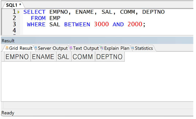 -> BETWEEN A AND B에서 A가 B보다 더 큰 값일 경우 아무것도 조회되지 않음
