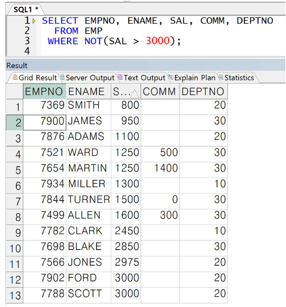 -> 이 경우 "3000보다 작거나 같은" 조건으로 변경 가능하므로 위처럼 NOT을 사용하지 않는다