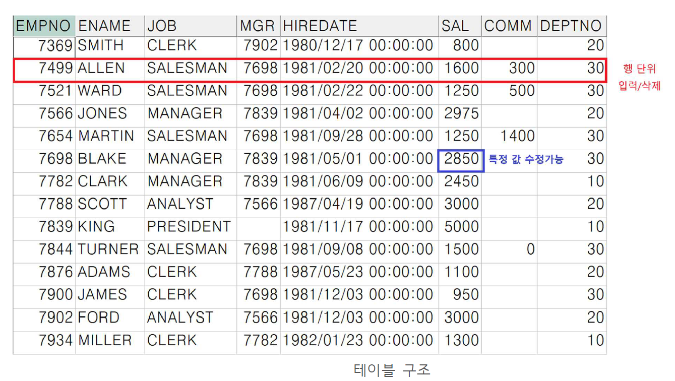 테이블은 행 단위로 데이터 입력, 삭제되며 수정은 값의 단위로 가능