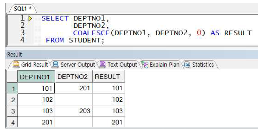 -> DEPTNO1과 DEPTNO2중 널 아닌값 출력 (둘 다 널이 아니면 맨 앞 순서대로 출력).