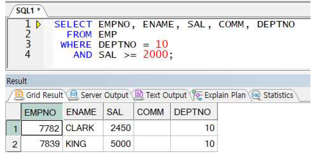DEPTNO가 10번이면서 SAL이 2000 이상인 직원 출력