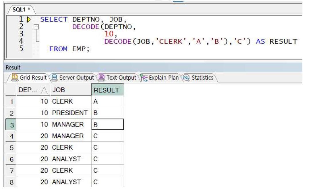 -> DEPTNO가 10이면서 JOB이 CLERK이면 A, CLERK 아니면 B, DEPTNO가 10이 아니면 C