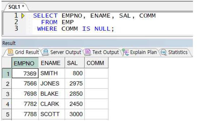 NULL 조회 시 IS NULL/ IS NOT NULL 연산자 사용(=연산자로 조회 불가)