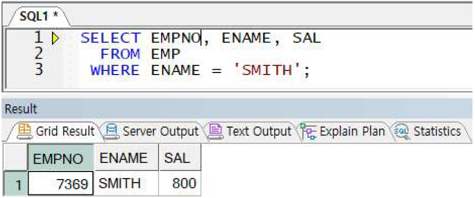 예제) 이름이 SMITH인 직원 조회(조건절에 문자 상수 사용)