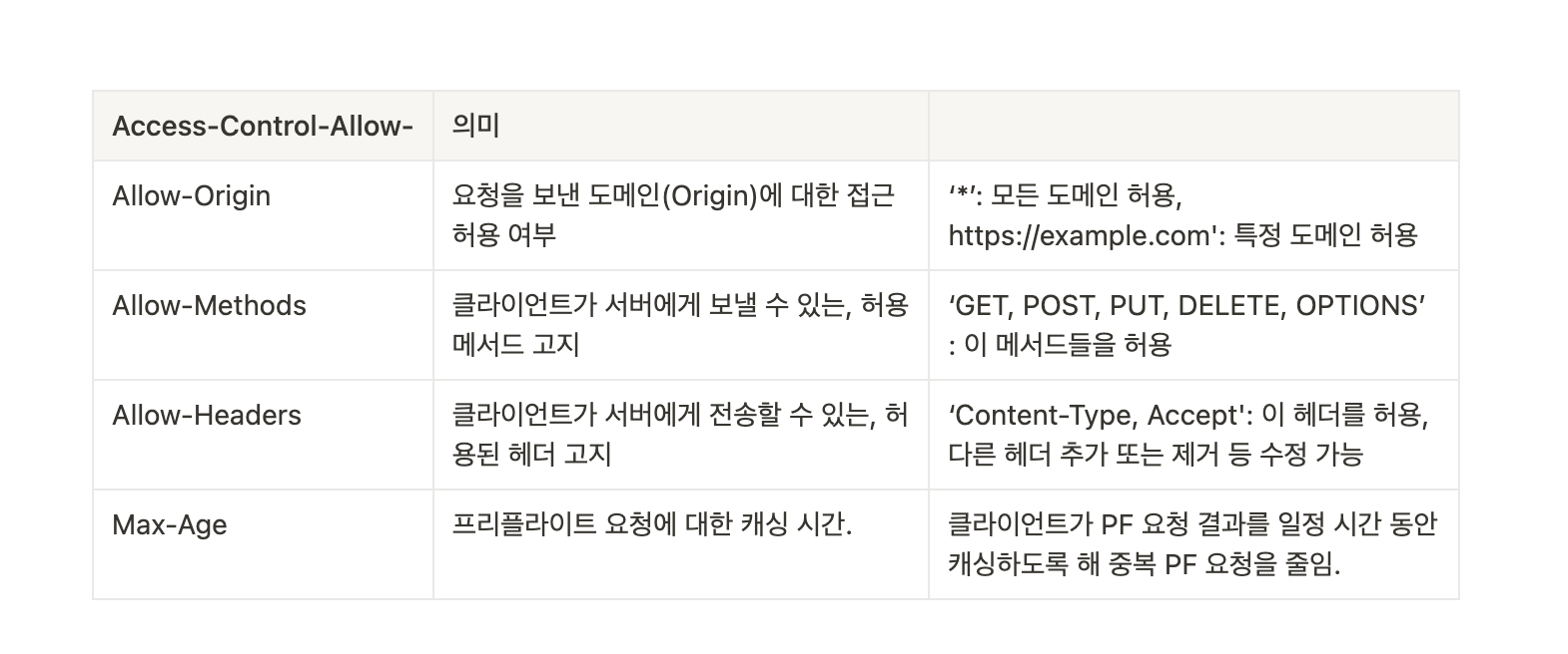 클라이언트가 서버로 요청을 보낼 때 이 헤더들이 응답에 포함되면, 브라우저는 해당 요청이 CORS 정책을 준수하는지 확인하고 허용 여부를 결정한다.
