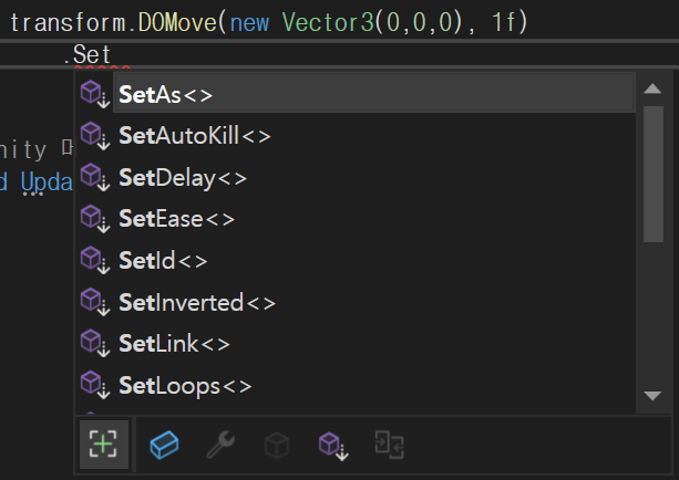 대표적으로 많이 사용되는 Set 설정으로 SetEase가 있으며, 이를 통해 컨트롤 대상의 변화하는 속도를 설정할 수 있다. (Default : Ease.Linear)