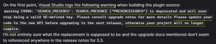 0>MenuSystemCharacter.cpp(173): Warning C4996 : 'SEARCH_PRESENCE': SEARCH_PRESENCE ("PRESENCESEARCH") is deprecated and will soon stop being a valid UE-defined key. Please consult upgrade notes for more details Please update your code to the new API before upgrading to the next release, otherwise your project will no longer compile.