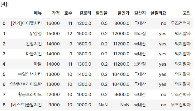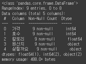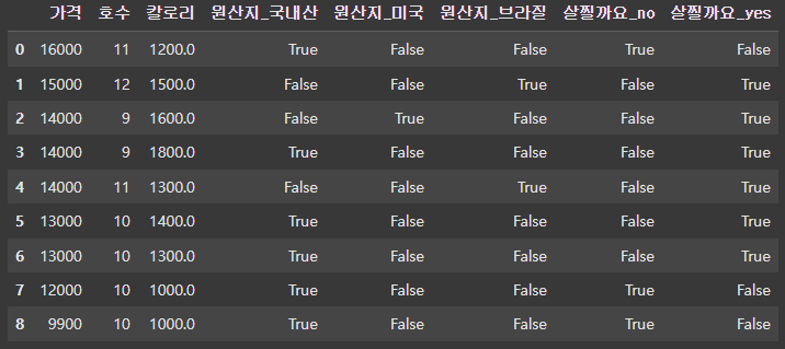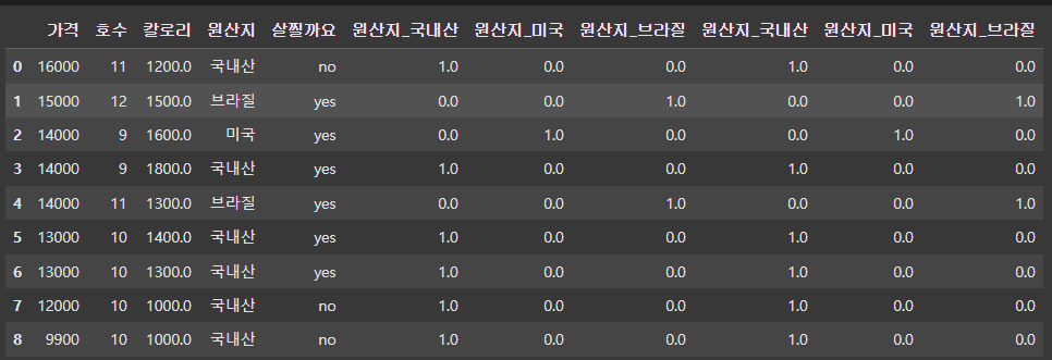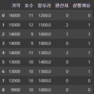 df = data[['가격', '호수', '칼로리', '원산지', '살찔까요']].copy()