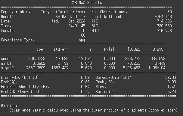 최적의 모델은 ARIMA(0, 0, 0)으로 확인됨