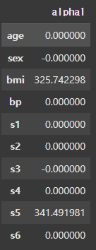 필요 없다고 판단되는 컬럼의 회귀 계수를 0으로 만들었음