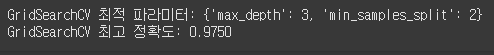 print('GridSearchCV 최적 파라미터:', grid_dtree.best_params_)