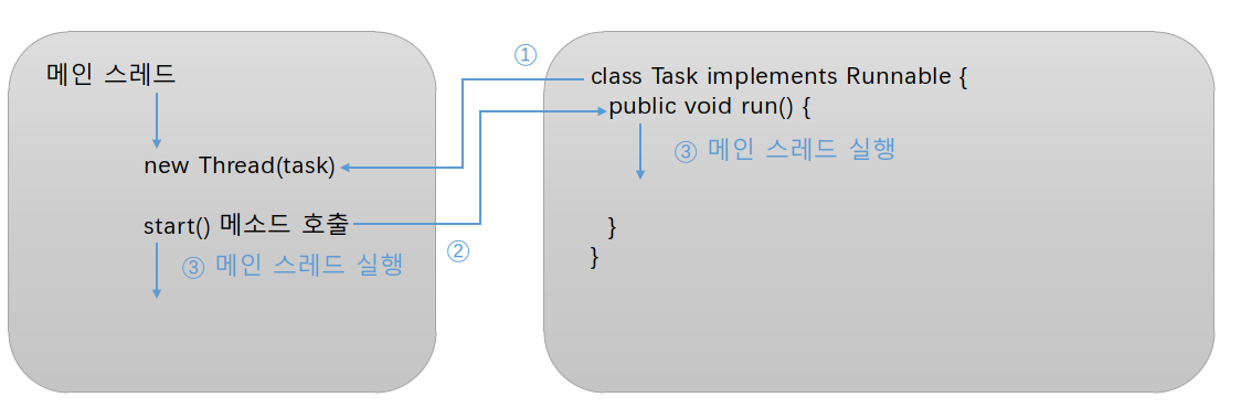 start( ) 메소드가 호출되면, 작업 스레드는 매개값으로 받은 Runnable의 run( ) 메소드를 실행하면서 작업을 처리한다. 다음은 작업 스레드가 생성되고 실행되기까지의 순서를 보여준다.