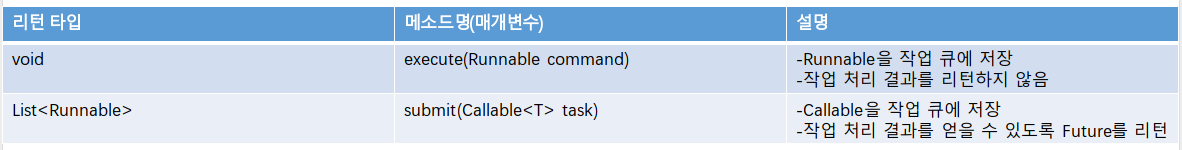 작업 처리 요청이란 ExecutorService의 작업 큐에 Runnable 또는 Callable 객체를 넣는 행위를 말한다. 작업 처리 요청을 위해 ExecutorService는 다음 두 가지 메소드를 제공한다.