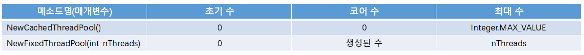 자바는 스레드풀을 생성하고 사용할 수 있도록 java.util.concurrent 패키지에서 ExecutorService 인터페이스와 Executors 클래스를 제공하고 있다. Executors의 다음 두 정적 메소드를 이용하면 간단하게 스레드풀인 ExecutorService 구현 객체를 만들 수 있다.