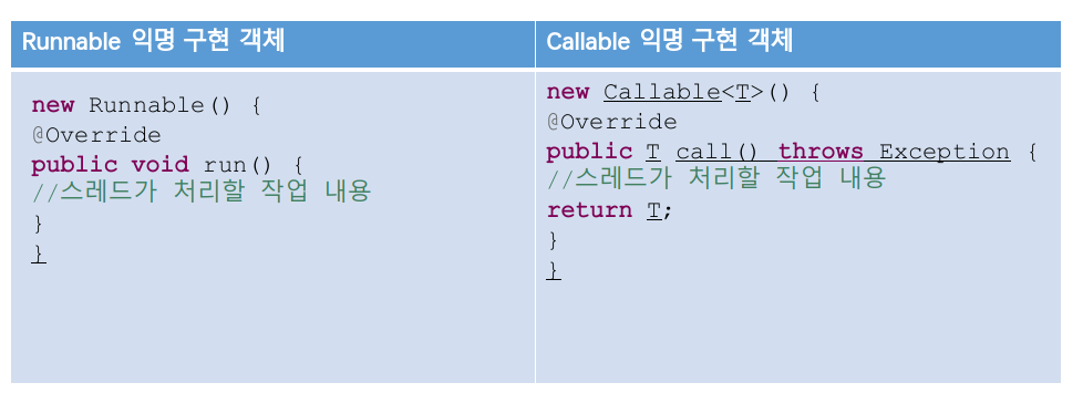 하나의 작업은 Runnable 또는 Callable 구현 객체로 표현한다. Runnable과 Callable의 차이점은 작업 처리 완료 후 return 값이 있느냐 없느냐이다. 다음은 Runnable과 Callable 구현 객체를 작성하는 방법을 보여준다.