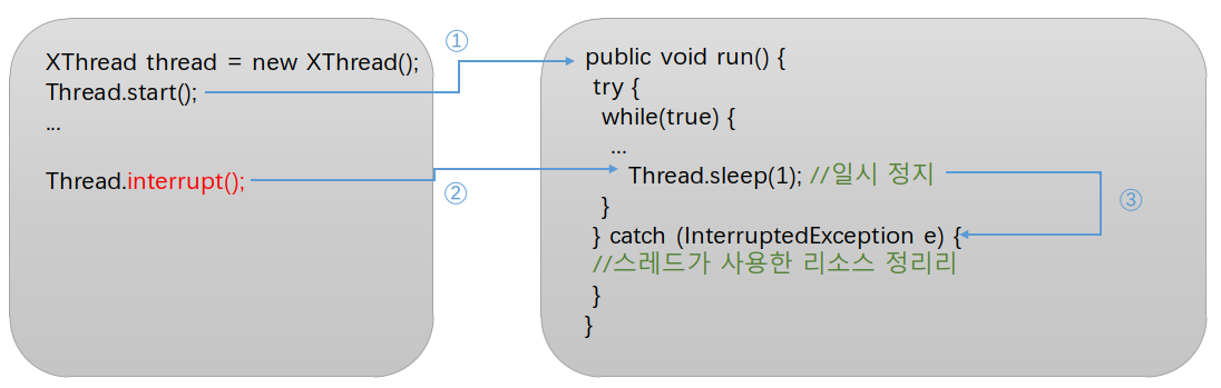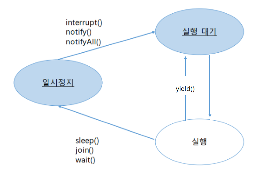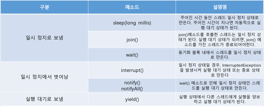 실행 상태에서 일시 정시 상태로 가기도 하는데 일시 정지 상태는 스레드가 실행할 수 없는 상태를 말한다. 스레드가 다시 실행 상태로 가기 위해서는 일시 정지 상태에서 실행 대기 상태로 가야만 한다. 다음은 일시 정지로 가기 위한 메소드와 벗어나기 위한 메소드를 보여준다.