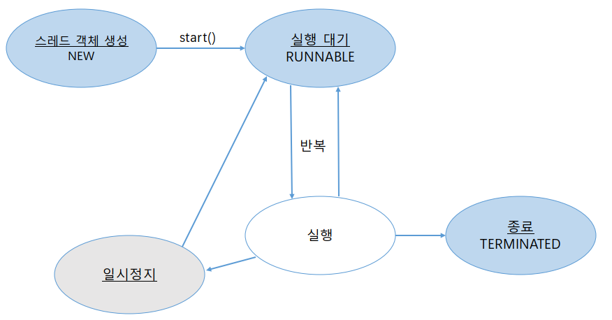 스레드 객체를 생성(NEW)하고, start( ) 메소드를 호출하면 곧바로 스레드가 실행되는 것이 아니라 실행 대기 상태(RANNABLE)가 된다. 실행 대기 상태란 실행을 기다리고 있는 상태다.
