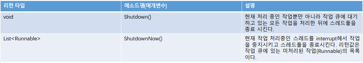 스레드풀의 스레드는 기본적으로 데몬 스레드가 아니기 때문에 main 스레드가 종료되더라도 작업을 처리하기 위해 계속 실행 상태로 남아 있다. 스레드풀의 모든 스레드를 종료하려면 ExecutorService의 다음 두 메소드 중 하나를 실행해야 한다.