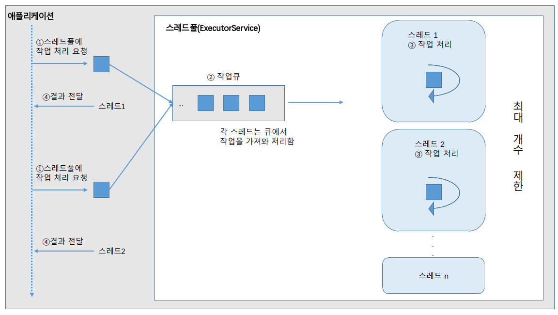 스레드풀은 작업 처리에 사용되는 스레드를 제한된 개수만큼 정해 놓고 작업 큐에 들어오는 작업들을 스레드가 하나씩 맡아 처리하는 방식이다. 작업 처리가 끝난 스레드는 다시 작업 큐에서 새로운 작업을 가져와 처리한다. 이렇게 하면 작업량이 증가해도 스레드의 개수가 늘어나지 않아 애플리케이션의 성능이 급격히 저하되지 않는다.