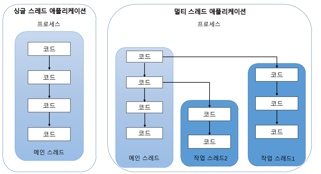 하나의 프로세스가 두 가지 이상의 작업을 처리할 수 있는 이유는 멀티 스레드가 있기 때문이다. 스레드는 코드의 실행 흐름을 말하는데, 프로세스 내에 스레드가 두 개라면 두 개의 코드 실행 흐름이 생긴다는 의미이다.
