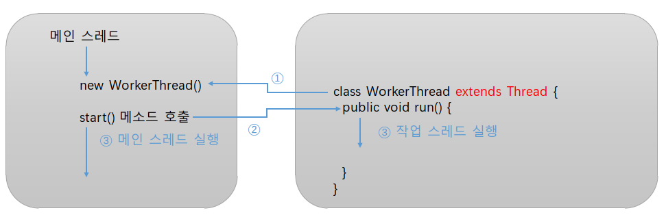 자바 프로그램은 메인 스레드가 반드시 존재하기 때문에 메인 작업 이외에 추가적인 작업 수만큼 스레드를 생성하면 된다. 자바는 작업 스레드도 객체로 관리하므로 클래스가 필요하다. Thread 클래스로 직접 객체를 생성해도 되지만, 하위 클래스를 만들어 생성할 수도 있다.