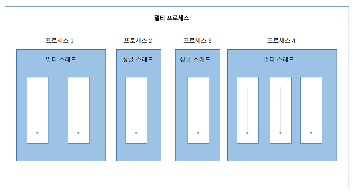 운영체제는 실행 중인 프로그램을 프로세스로 관리한다. 멀티 태스킹은 두 가지 이상의 작업을 동시에 처리하는 것을 말하는데, 이때 운영체제는 멀티 프로세스를 생성해서 처리한다. 하지만 멀티 태스킹이 꼭 멀티 프로세스를 뜻하지는 않는다.