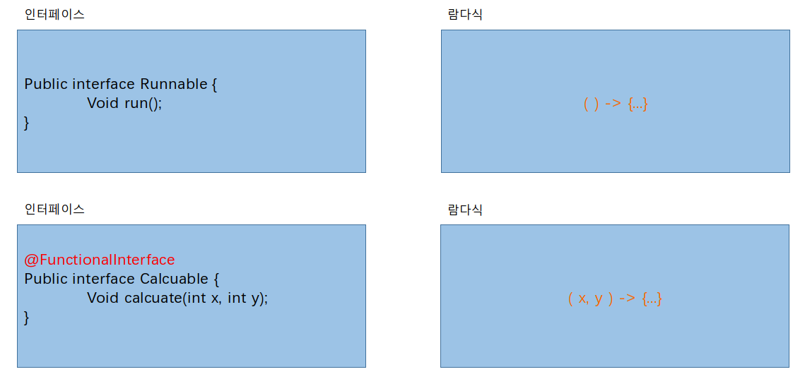 - @FunctionalInterface가 기술된 인터페이스만 람다식으로 표현이 가능하다.