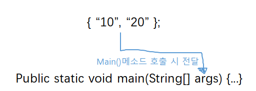 공백으로 구분된 10과 20은 문자열로 취급되며 String[] 배열의 항목 값으로 구성된다. 그리고 main() 메소드 호출 시 매개값으로 전달된다.