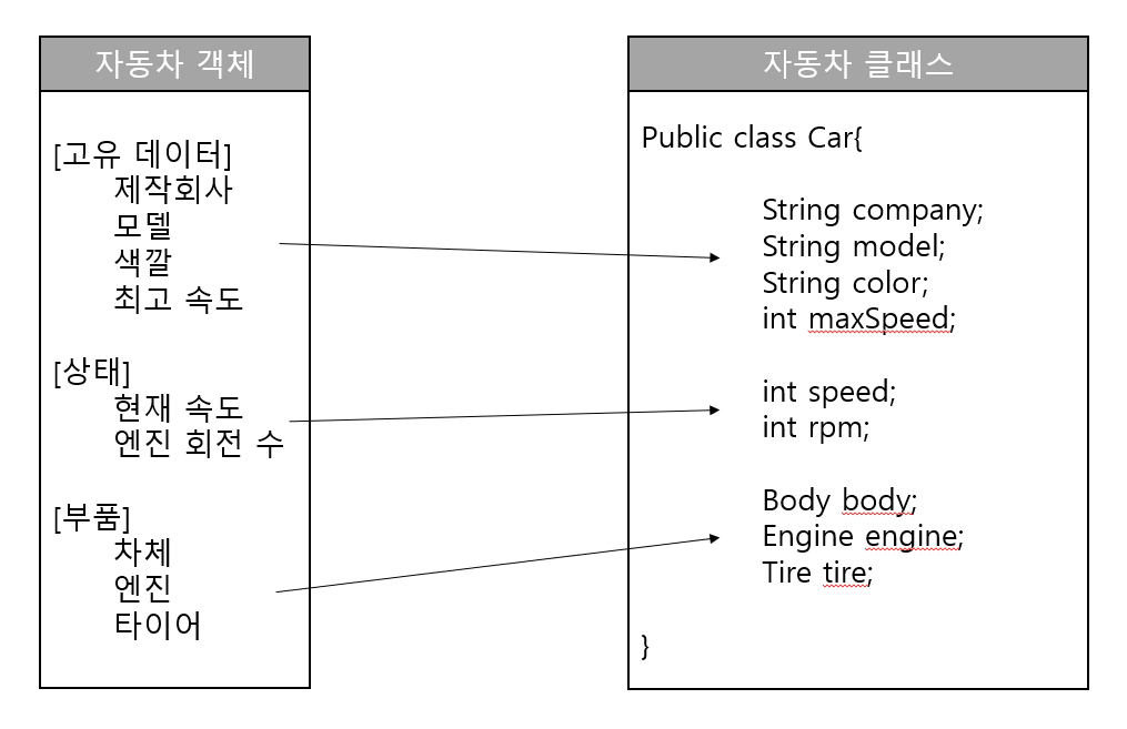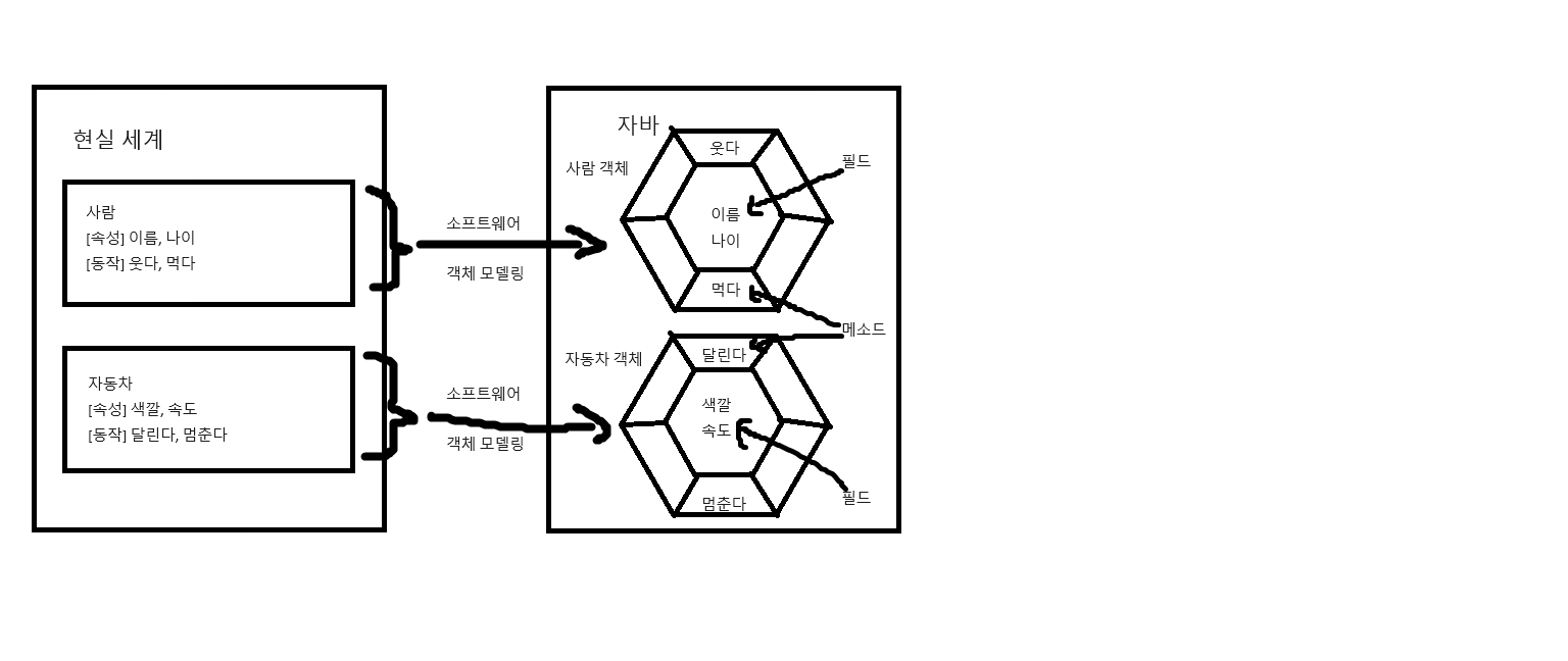 객체는 속성과 동작으로 구성된다. 사람은 이름, 나이 등의 속성과 웃다, 걷다 등의 동작이 있고, 자동차는 색상, 모델명 등의 속성과 달린다, 멈춘다 등의 동작이 있다. 자바는 이러한 속성과 동작을 각각 필드(field)와 메소드(method)라고 부른다.