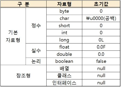 정수 타입 필드는 0, 실수 타입 필드는 0.0, 그리고 boolean 필드는 false로 초기화 되는 것을 볼 수 있다. 참조 타입은 객체를 참조하고 있지 않은 상태인 null로 초기화가된다.