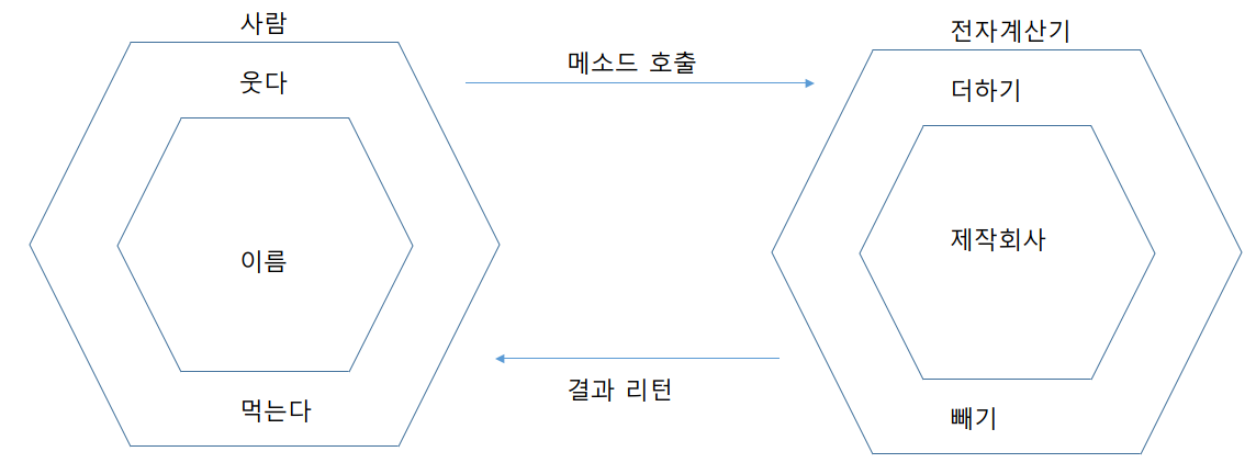 현실 세계에서 일어나는 모든 현상은 객체와 객체 간의 상호작용으로 이루어져 있다. 예를 들어 사람은 전자계산기의 기능을 이용하고, 전자계산기는 계산 결과를 사람에게 리턴하는 상호 작용을 한다.