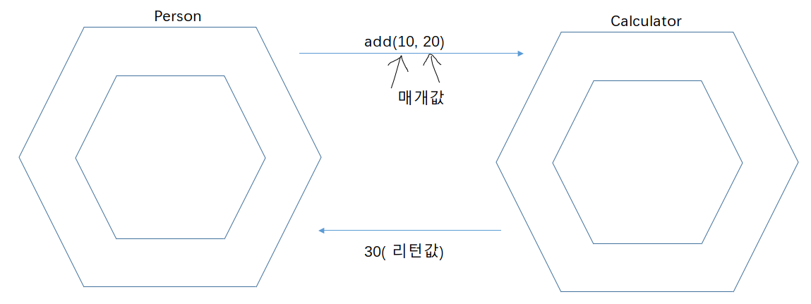 객체 지향 프로그램에서도 객체들은 다른 객체와 서로 상호작용하면서 동작한다. 객체들 사이의 상호작용 수단은 메소드이다. 객체가 다른 객체의 기능을 이용할 때 이 메소드를 호출한다.