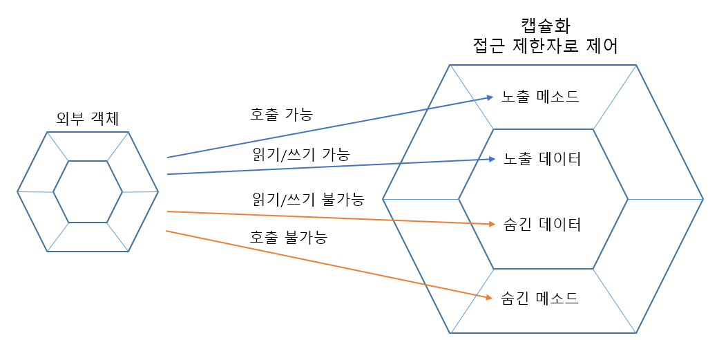 캡슐화(Encapsulation)란 객체의 데이터(필드), 동작(메소드)을 하나로 묶고 실제 구현 내용을 외부에 감추는 것을 말한다. 외부 객체는 객체 내부의 구조를 알지 못하며 객체가 노출해서 제공하는 필드와 메소드만 이용할 수 있다.