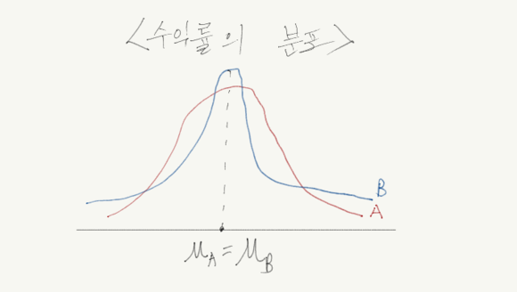 위의 그림과 같이 A와 B의 수익률의 평균은 같지만 B의 그래프의 분포의 꼬리 쪽이 더 두껍기 때문에 불확실성이 높다.