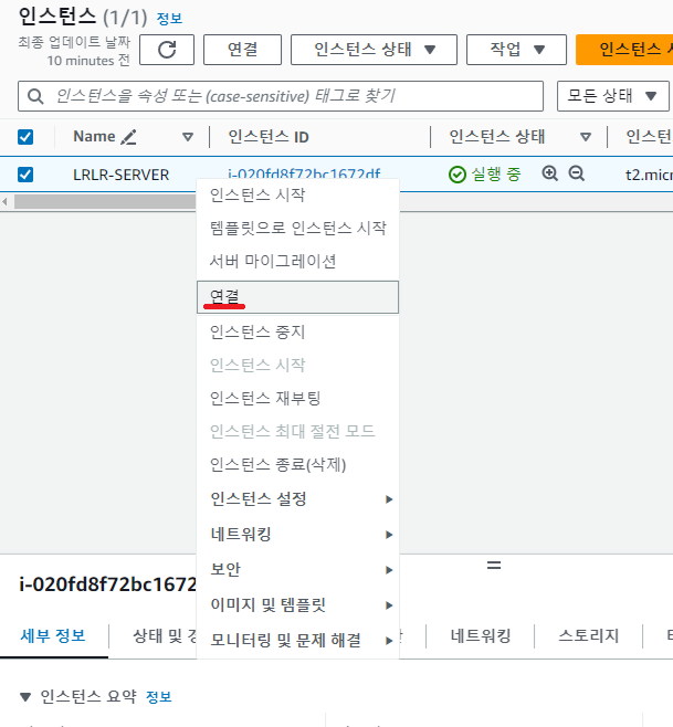 (2) CI/CD 셋팅을 해주기 위해 EC2 인스턴스 접속하여 "연결" 버튼 클릭