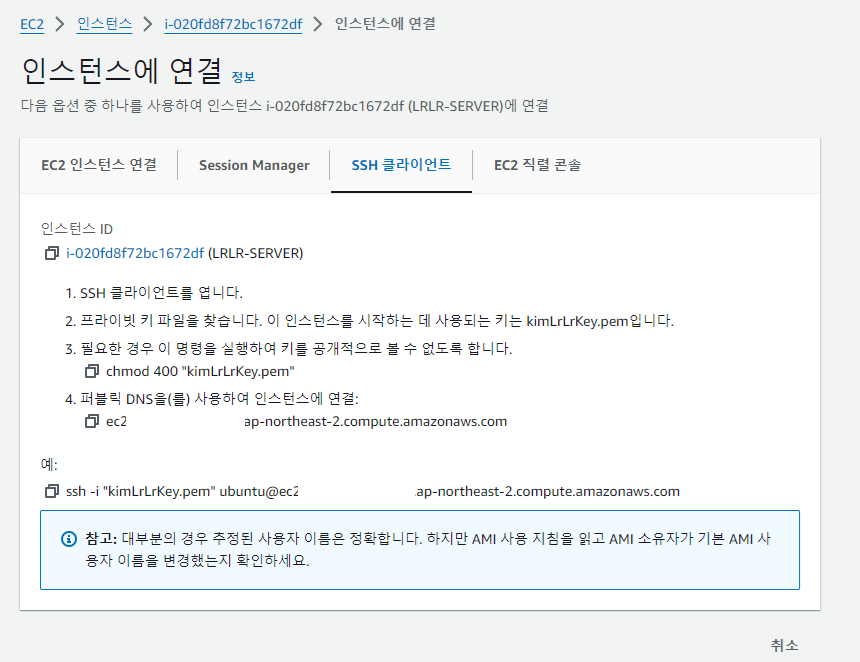 하단에 있는 ssh -i로 시작하는 명령어를 복사해서 VS코드 터미널을 열어준다.