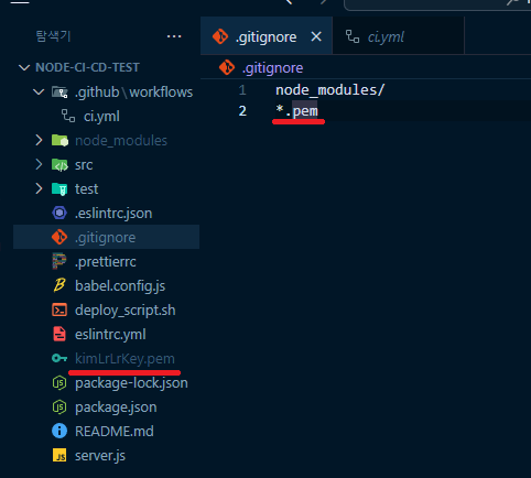 이 때, pem파일이 노출되지 않도록 .gitignore에 *.pem을 추가해 넣어주자!