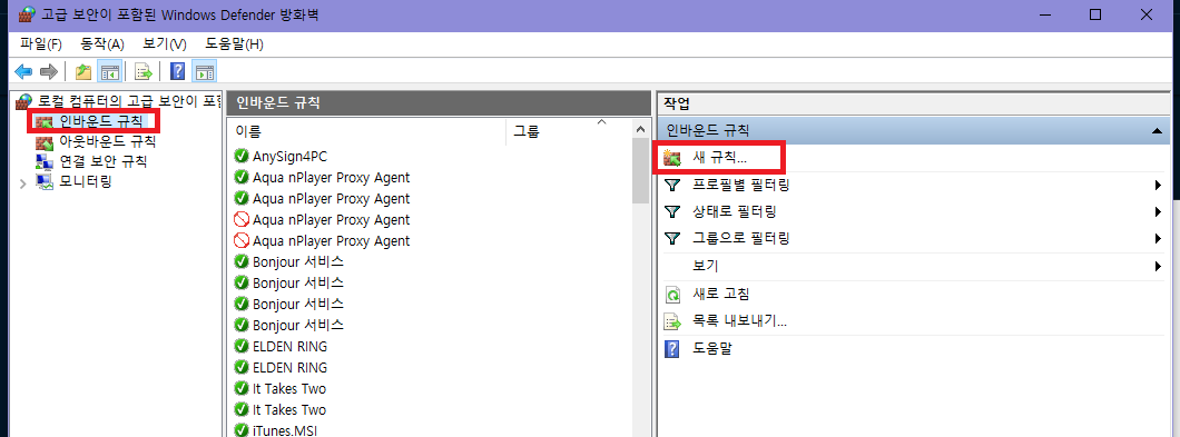 windows Defender 방화벽에서 인바운드 규칙 클릭 -> 새 규칙