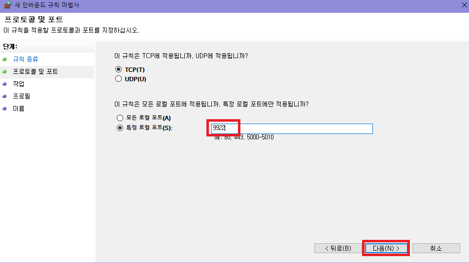 allow시켜줄 포트번호 넣고 다음 클릭