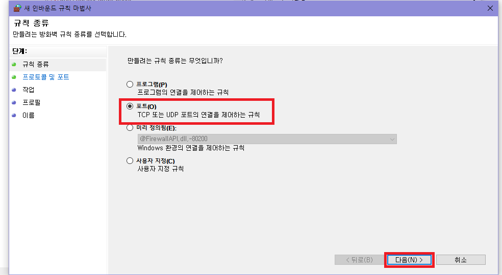 규칙 종류 포트 선택하고 다음 클릭