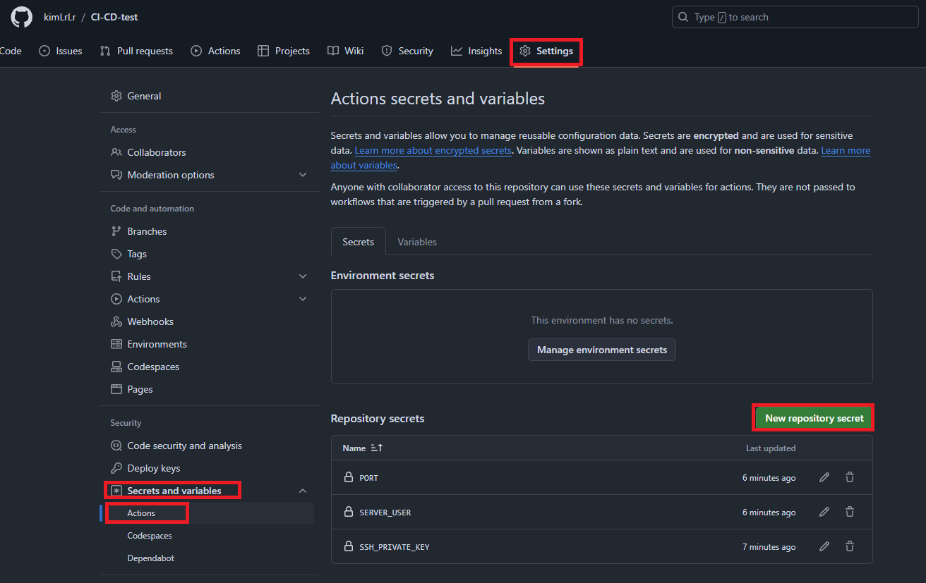 secret의 사용이 필요한 프로젝트에 들어가 setting탭 클릭 -> Security의 Secrets and variables -> Action클릭 -> New repository secret 클릭해서 새로운 secret 생성