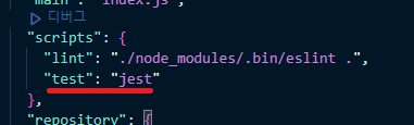package.json의 script에 아래 코드 추가!"test": "jest"