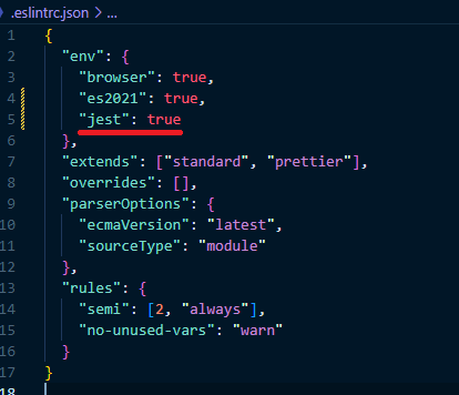 eslintrc.json에서 env 설정eslintrc.json에서 env 설정에 jest 설정을 추가해줘야