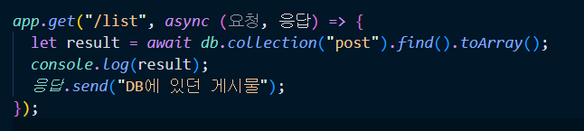 server.js로 가서 해당하는 collection에 모든 document를 가져오는 코드를 추가해준다.app.get("/list", (요청, 응답) => {